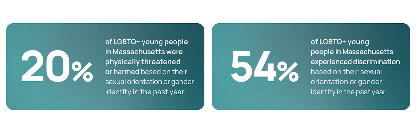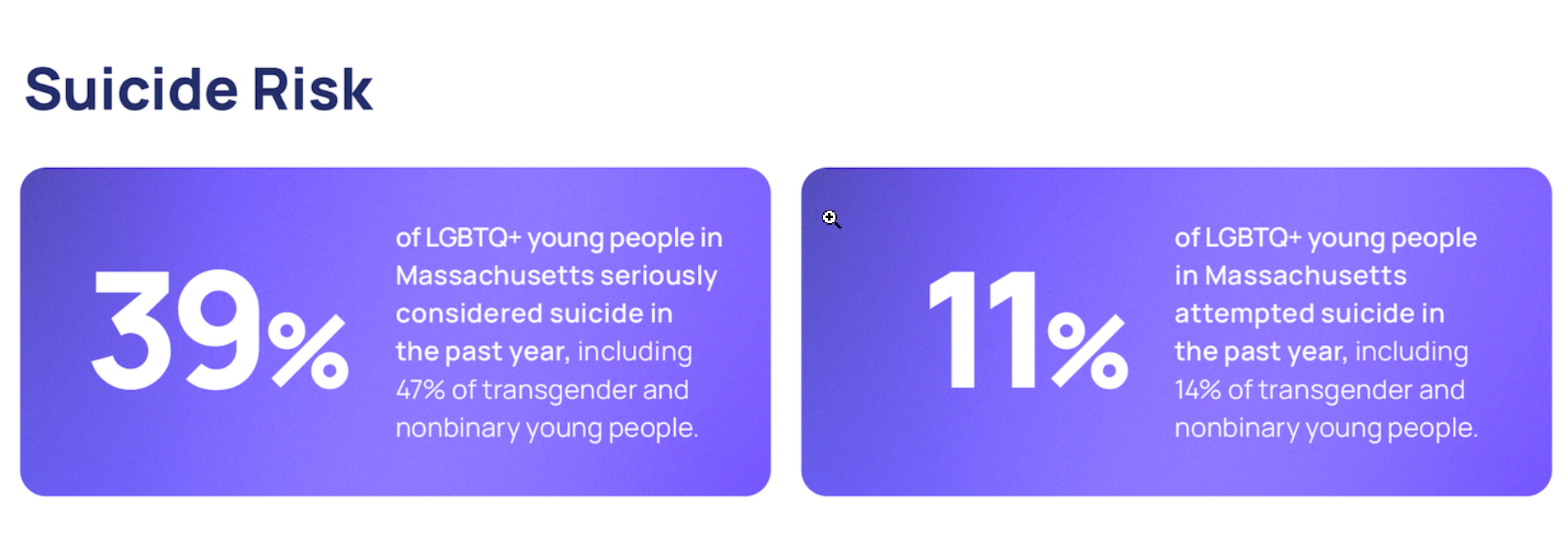 Statistics from The Trevor Project's 2024 Survey on the Mental Health of LGBTQ+ Young People in Massachusetts Citation: Nath, R., Matthews, D., Hobaica, S., Eden, T.M., Taylor, A.B., DeChants, J.P., Suffredini, K. (2025). 2024 U.S. National Survey on the Mental Health of LGBTQ+ Young People by State. West Hollywood, CA: The Trevor Project. www.thetrevorproject.org/survey-2024-by-state/. doi: 10.70226/LDYM4046