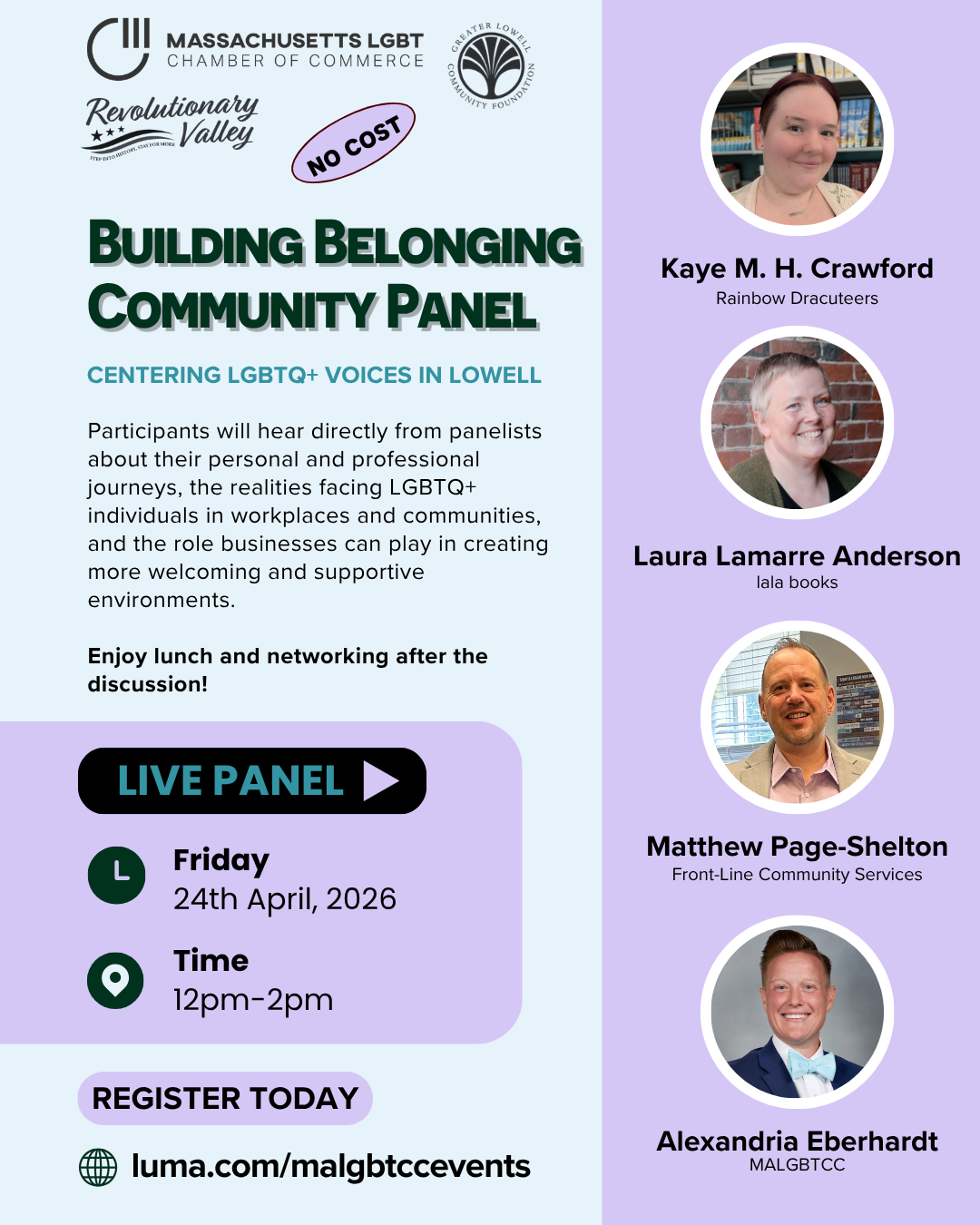 The conversation will be moderated by Alexandria Eberhardt, Executive Director of the Massachusetts LGBT Chamber of Commerce.